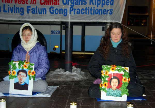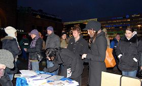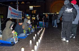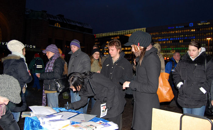【明慧网二零零九年一月二十九日】二零零九年一月二十七日,中国新年的正月初二,芬兰赫尔辛基的法轮功学员在下班的高峰时间,来到赫尔辛基中心火车站一侧,点起一盏盏烛灯,挂起“法轮大法好”、“制止中共活体摘取法轮功学员器官的罪行”等横幅,深切悼念九年多来在中共邪党对修炼“真、善、忍”的法轮功学员的残酷迫害中死难的同修,呼吁世人共同制止迫害。