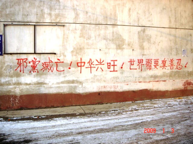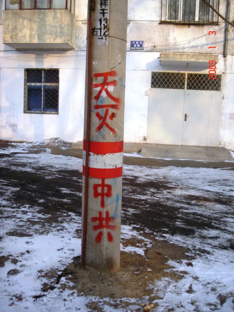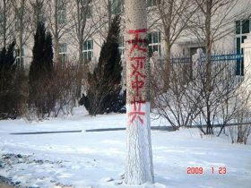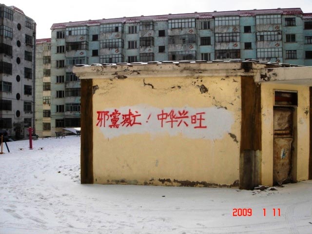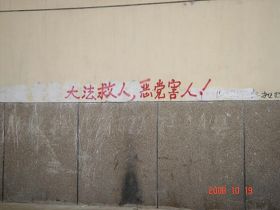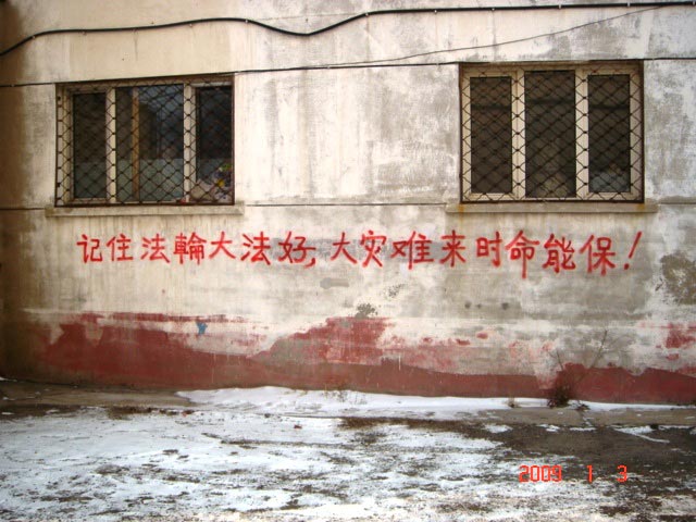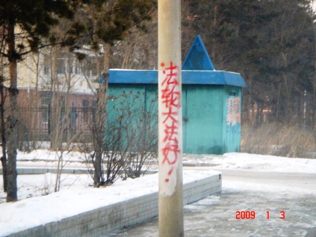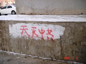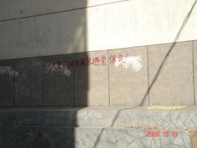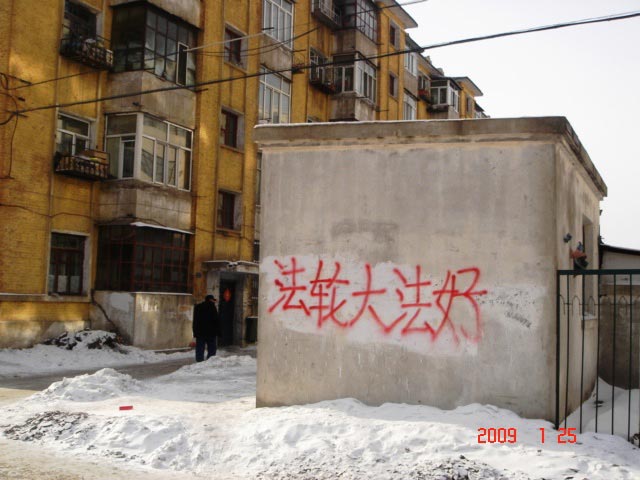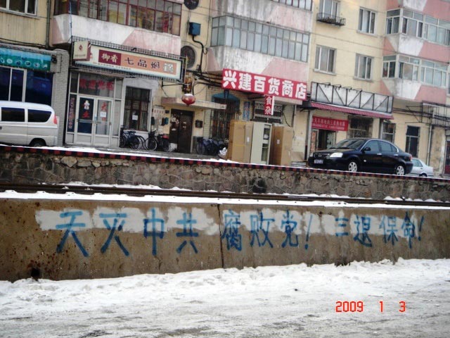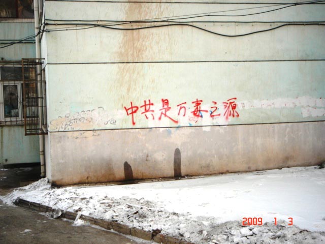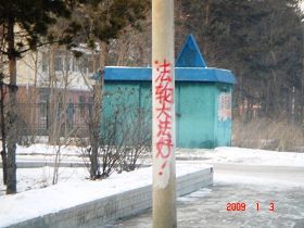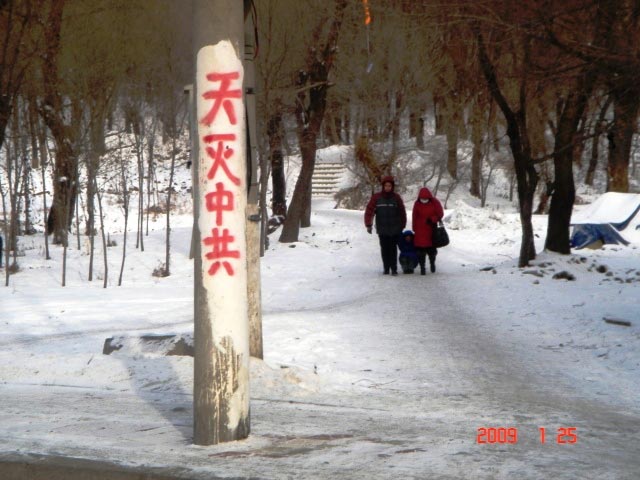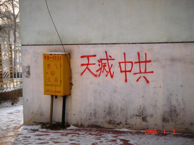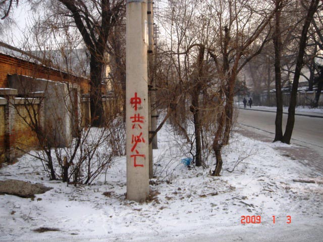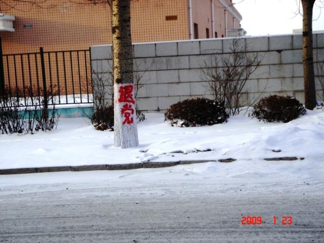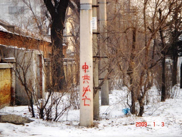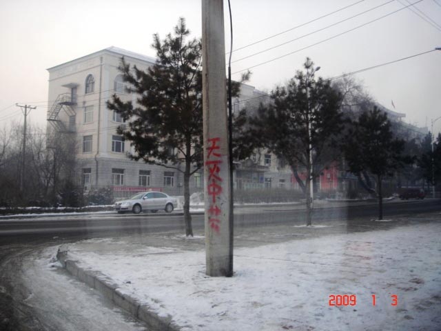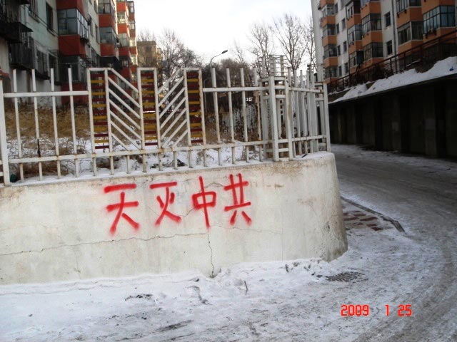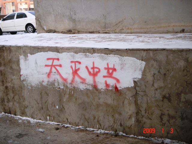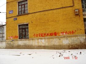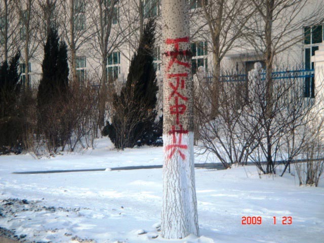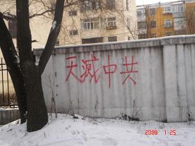 【明慧网二零零九年一月三十日】在中国大陆北方某城市遍地出现大量灭党喷漆和条幅标语。