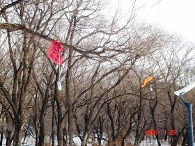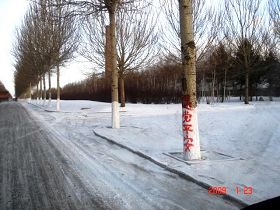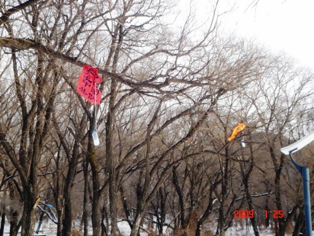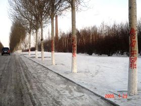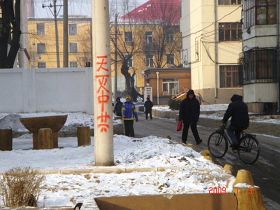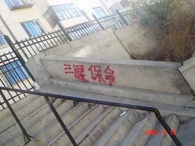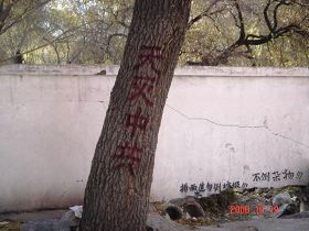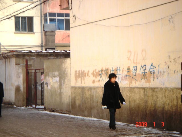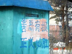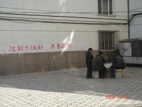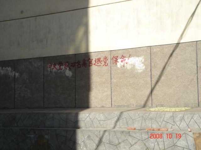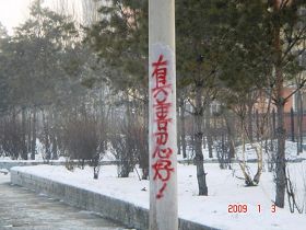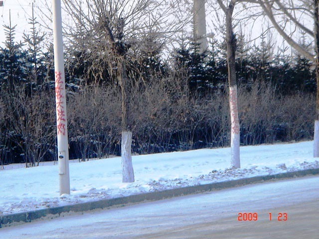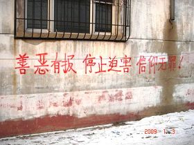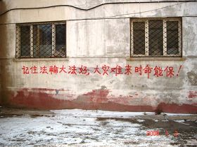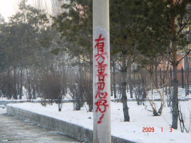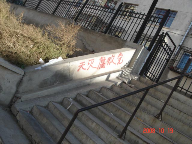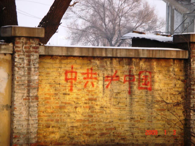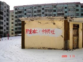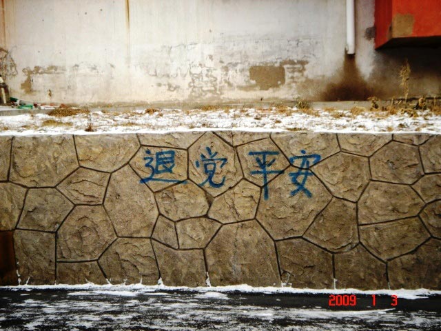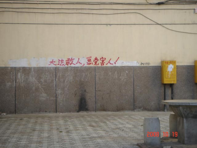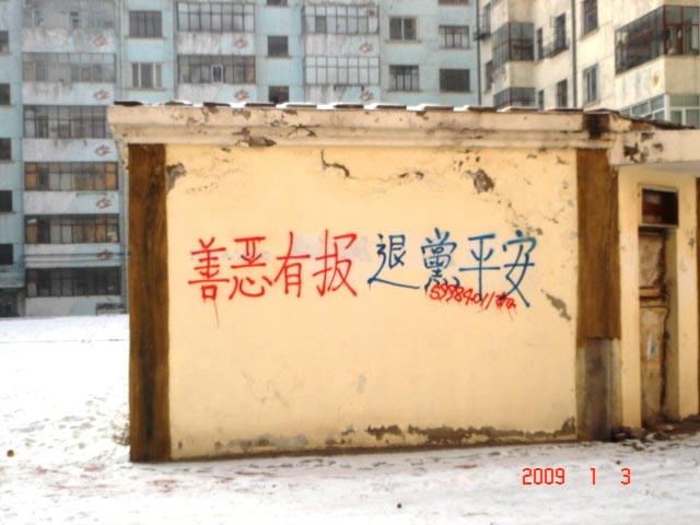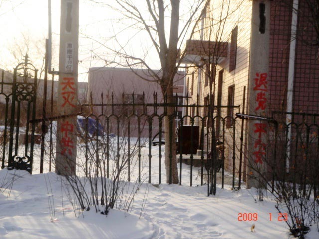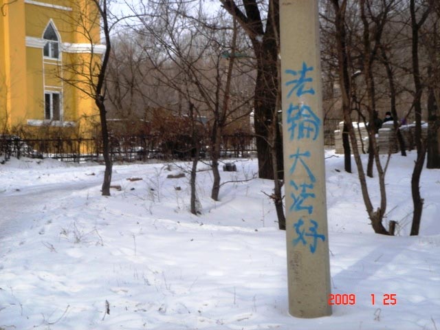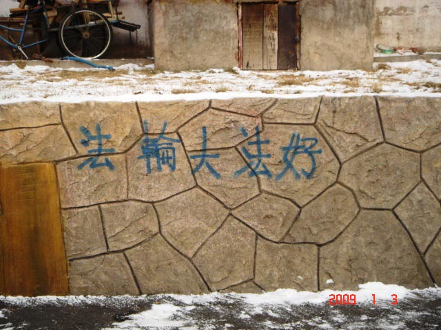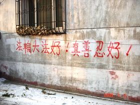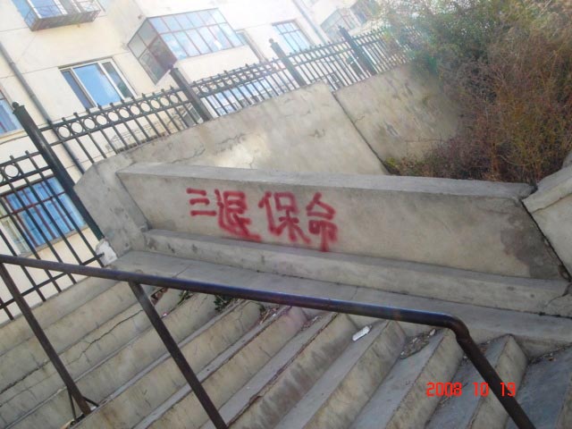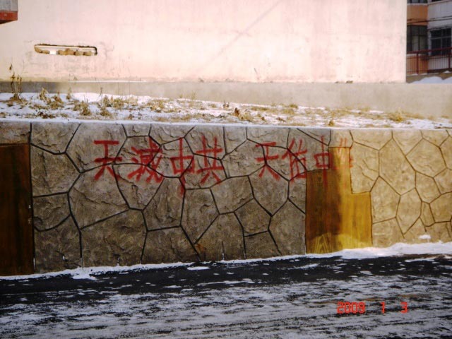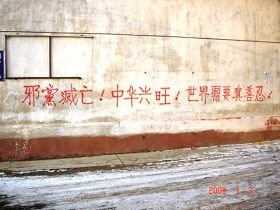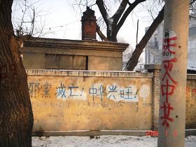 【明慧网二零零九年一月三十日】在中国大陆北方某城市遍地出现大量灭党喷漆和条幅标语。