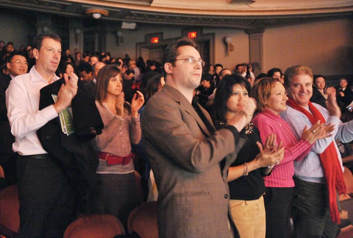 ![]() 银行家培恩(Salvatory Pane)(左)和太太安琪(Andrie Pane)(左二),以及借贷顾问尼格鲁(Scott Negro)(左四)和太太娜塔莎(Natasha Negro)(左三)坐在最前排观看演出。演出结束时,他们起来鼓掌,向演员致意。 |