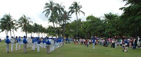 天国乐团连续演奏了《法轮大法好》、《欢乐颂》、《法鼓法号震十方》、《法正乾坤》、《送宝》、《普世欢腾》等乐曲。全体乐团成员精神抖擞,面带微笑,《法轮大法好》与《法鼓法号震十方》等乐曲响彻云天,雄壮、嘹亮的号声与铿锵有力的鼓声交响呼应。精彩的演出,别开生面,围观人群不断地爆发出阵阵热烈的掌声。
