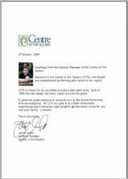 广场中央剧院(CITS)剧院总经理的贺词介绍,CITS以令人难以置信的视听效果而闻名于世,一九八零年建立以来,大厅的设计被全球同行广泛模仿参照。