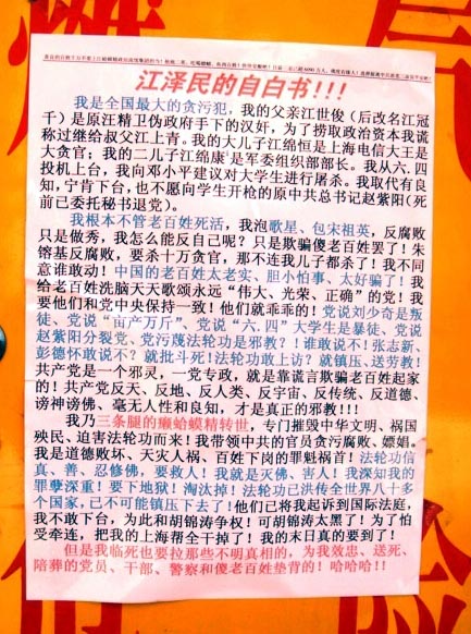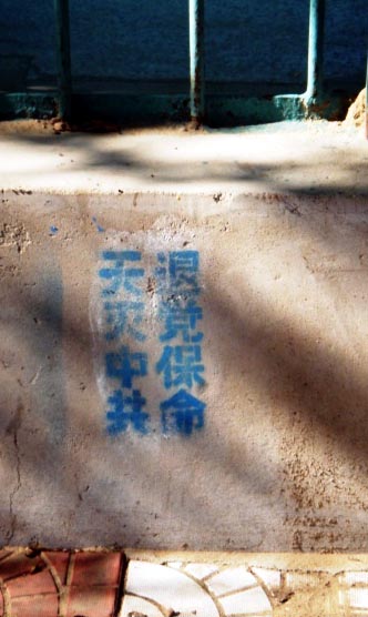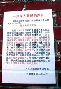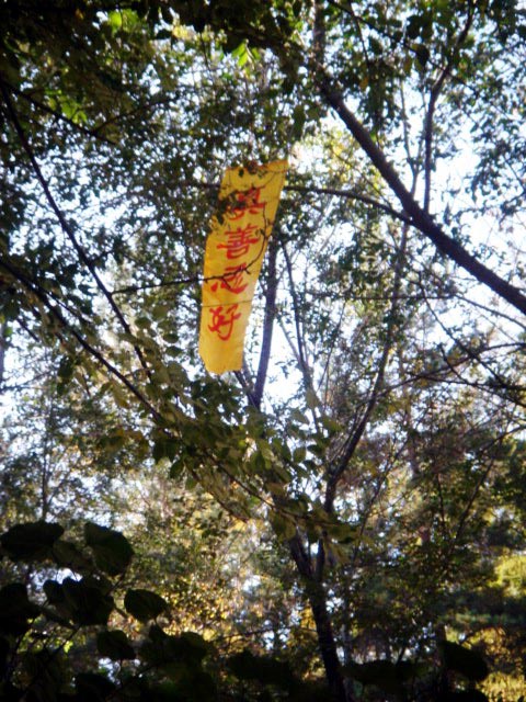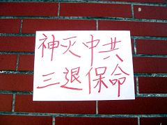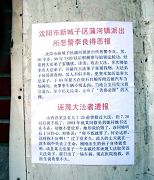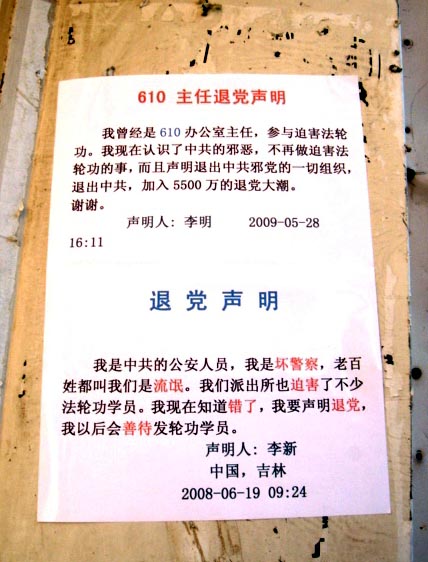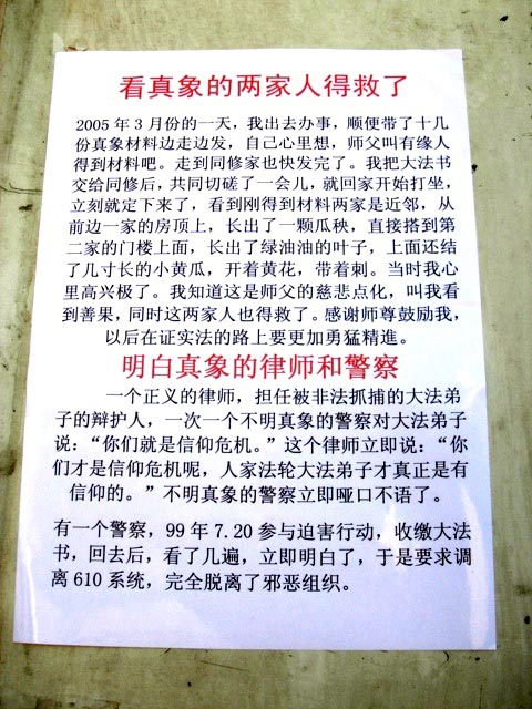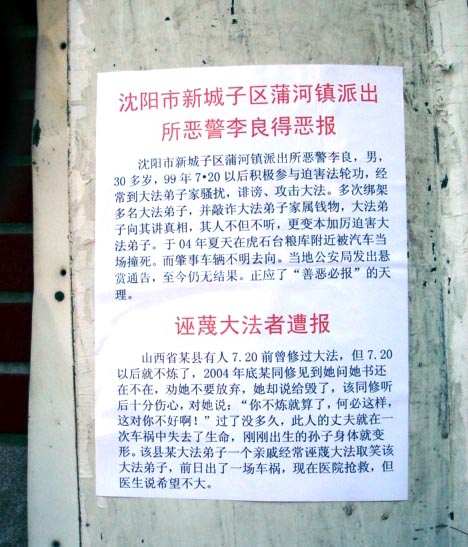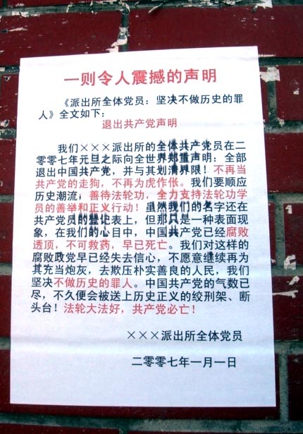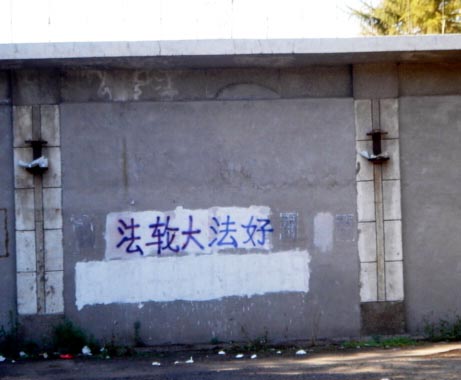 这是在中国大陆北方某大城市的城市、乡村道路两边的电线杆上、围墙上、大树上家属楼的墙上、门上、及体育广场的立柱上等地方出现条幅、喷漆和不干胶标语——条幅上写着:“法轮大法好”、“真善忍好”、“天灭中共”、“退党保命”;喷漆喷出的标语有:“法轮大法好”、“真善忍好”、“天灭中共”、“退党保命”、“中共窃国六十周年”、“驱除中共恶党,还我中华”、“恶党不亡,国无宁日”、““法轮大法好”、“平反法轮功,法办江泽民”等。