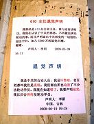 不干胶上写着:“大法洪传114个国家的图片”、“迫害法轮功彻底失败了”、“江泽民的自白书”、“天灭中共三退平安”、“中国大陆公安国安迫害法轮功恶报知多少?”、“一则令人震撼的声明”、“老百姓觉醒了”、“派出所的集体退党声明”、“迫害大法遭恶报的事例”及退党声明等。