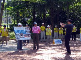 这天清早,一辆中型游览车载来二十多名大陆观光客。走在前面带队的导游对学员道早安,并且大声说:“法轮大法好!”后面的观光客有人附和:“法轮大法好!”有人说:“这里也有法轮功。”另一位轻声说:“好咧,一大早就看到法轮功。”