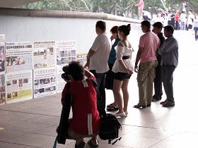 在新加坡风景点鱼尾狮的桥下,很多人聚精会神地观看法轮功学员的真相展板