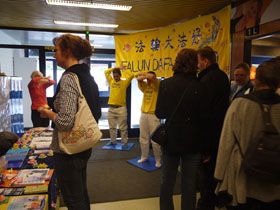 ![]() 法轮大法学员在赫尔辛基精神和信息博览会上介绍功法 |
