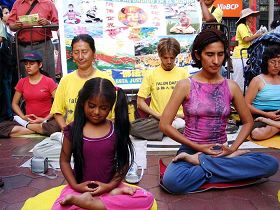 ![]() 在阿根廷的中国城,许多民众在法轮功展位前当场学习功法 |