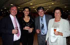 ![]() 律师晒力(左一)与太太(左二)和朋友在日内瓦第3场神韵晚会中间休息时接受采访后合影 |