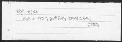 与父母分离已一年多的小微红现在也已经上一年级了。她给爸爸、妈妈的一封信中写道:“爸爸、妈妈:我读小学一年级了,我想你们,你们快回来吧!”