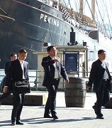 广东省劳教局局长兼党委书记施红辉(中)与随行者在纽约十六号码头。