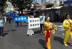 以色列法轮功学员在中领馆前集会,声援六千万中国人退出中共党、团、队组织。