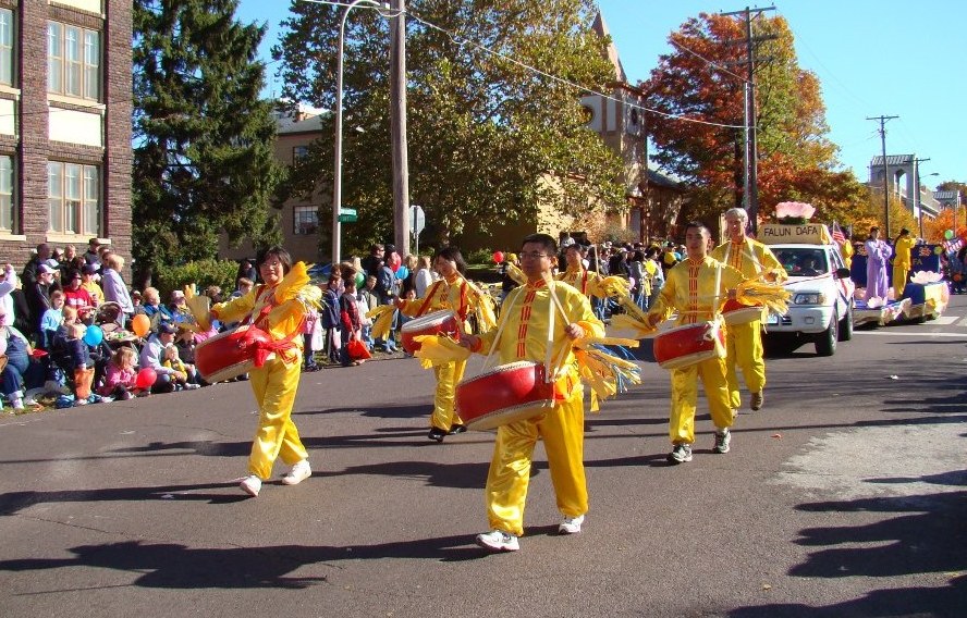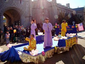 在多姿多彩的游行队伍中,法轮功学员的花车方阵与众不同。“法轮大法”横幅先导,随后是鼓队,由中西方学员组成的这个鼓队,身挎唐鼓,整齐而铿锵的鼓声,把街道两边人们的注意力吸引到这个独具中国传统特色的方队。以莲花为装饰的花车上,身着中国传统服饰的学员在悠扬的音乐中表演功法。看到花车,人们纷纷鼓掌,有的目不转睛的追随着花车,脸上满是向往的神情;有的把法轮功学员的表演全部拍摄下来;有的想更多了解关于法轮功的内容。很多人高兴地接过法轮大法简介,有的急不可待地表示想学这个功法。