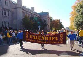 ![]() 以“法轮大法”横幅为先导的队伍吸引了众人的目光 |