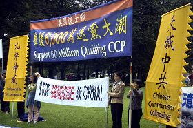 活动主办单位波士顿退党服务中心的周女士介绍,自二零零四年十一月《九评共产党》发表,五年时间里,波士顿退党服务中心通过在中国城摆退党摊位,以及打电话给大陆民众等方式,已为许多海内外华人办理了退出中共党、团、队的手续。