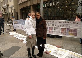 这两个年轻的女士从别的城市来科隆经过展位,当了解到在中国有一群人因为他们的信仰被残酷迫害时,她们在制止中共活摘法轮功学员器官征签表上签名,并在横幅前合影留念。