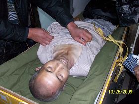 下午2点多,黄立忠由一名犯人搀扶着来到接见室,妻子都认不出他了,面色憔悴,身体枯瘦如柴,牙齿变形,说话有气无力,身体颤抖,仅5个月的时间,好端端的一个人变成了这个样子!47岁的人看起来苍老的象60多岁,她4月中旬见他时,他身体一切正常,并且精神很好,现在变成了这个样子。见面后,他妻子就告诉他:“他们不让我见你,说你违纪。”他说:“说我违纪了?当时他们把我电的差点死过去,后来一点一点缓过来了。”她问:“什么时候啊?”他说:“4月20日。”她问他:“谁电你了?”他说:“是王建军!”她又问:“还有谁打你吗?”他说:“甭提了,没有人再打我,我也遭老罪了!”(意思是在遭受电刑之后,黄立忠又受尽各种折磨)她想继续追问详情,被旁边病监的警察打断,他又告诉妻子,他由于受到严重电刑(电刑就是身体缠上电线后通电体表不留伤痕),导致他耳边有时能听见,有时听不见。当时他虚弱的很,说话费劲,身体一直抖动不停。