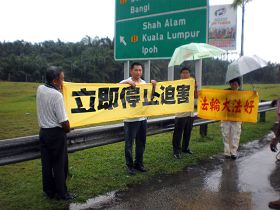 ![]() 胡锦涛的车队经过吉隆坡国际机场的收费站之时,法轮功学员冒雨打出横幅 |