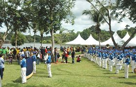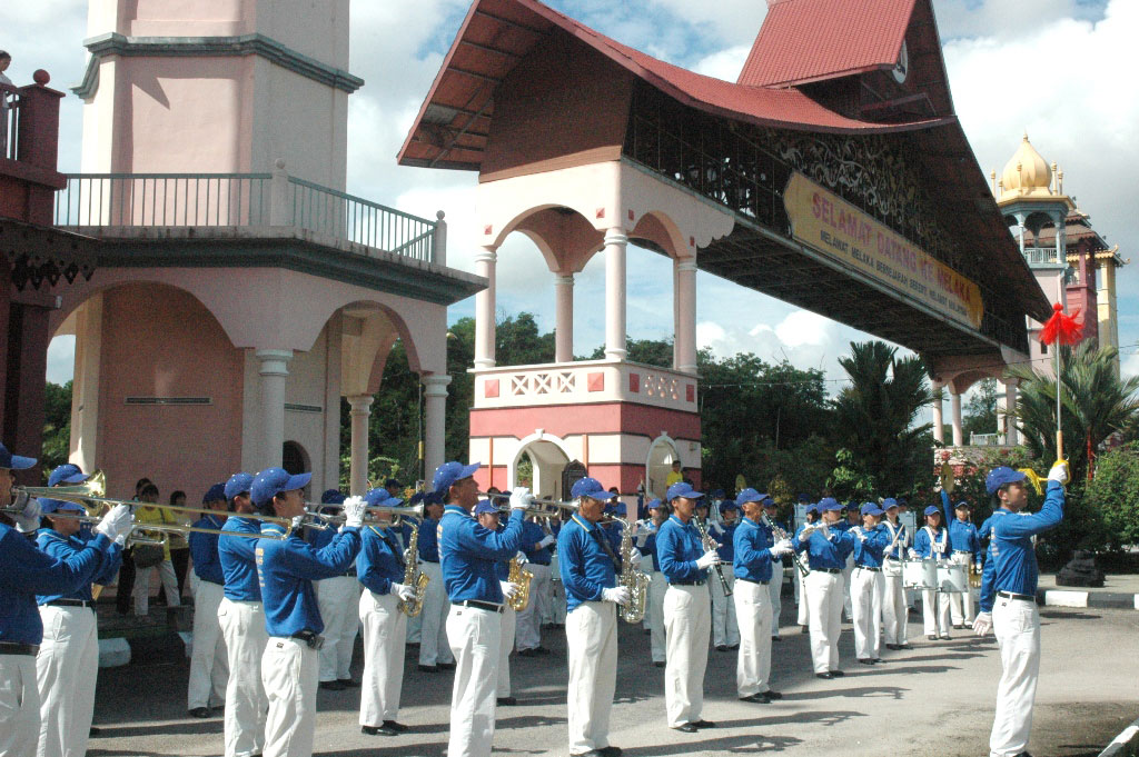 ![]() 天国乐团抵达马六甲,在龙舟公开锦标赛开幕前,在马六甲城门前演奏。 |