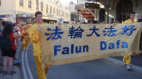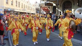 游行的当天,晴空万里,徐徐的凉风使人倍感身心的舒适。法轮功学员们身着金黄色的传统中国服装,脸带友善的微笑,在“法轮大法好”与“喜庆”两首歌曲的伴奏下,打着腰鼓前行,散发出修炼人祥和慈悲的能量。队伍经过之处,围观的民众报以热烈的掌声,更有不少的观众向学员们道谢。