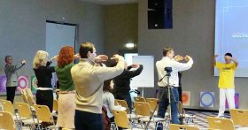![]() 法轮功学员在前面演示,与会者跟着一起炼。 |