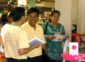 在博览会的展位上,法轮功学员摆放了美丽的纸莲花、大法书籍、真相资料,放映着教功录像片,并布置了大法洪传各地以及在中国遭受中共恶党迫害的图片展,来往参观者络绎不绝。