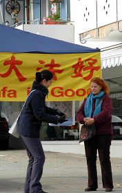 许多路人接过介绍法轮功的真相报纸。