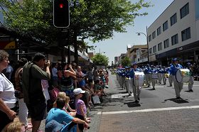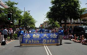 现在的南半球已进入初夏,当天气温高达三十七度,悉尼天国乐团吹奏着“法轮大法好”、“法正乾坤”、“法鼓法号震十方”、“送宝”、“法轮圣王”,响亮的鼓乐声响彻了上空。