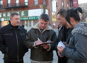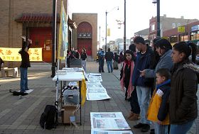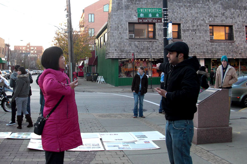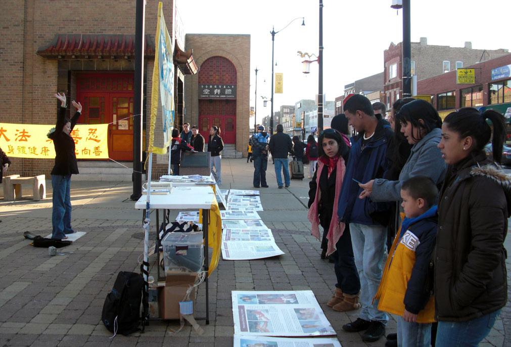 当天很多到芝加哥来过感恩节的大陆留学生途经现场,了解迫害真相和接了《九评共产党》的小册子后,纷纷声明退出中共恶党的团、队组织。一下午共有三十五位华人声明三退(党、团、队),其中大多是年轻学生。