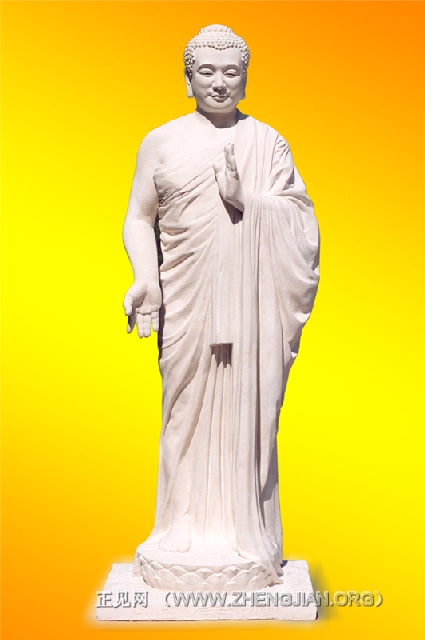 这使我想起二零零九年九月,在釜山国际文化中心举办的“真善忍国际美展”上的一幕。美展上有一尊雕像,是一尊佛像。这尊佛像通体洁白,单掌立于胸前,另一掌掌心朝前,满脸的悲悯与关爱(见下图)。说不出什么原因,只要看一眼这尊佛像,就会被他周身散发出来的无量的慈悲所打动。在佛像面前,人会不由自主的生出敬仰来。