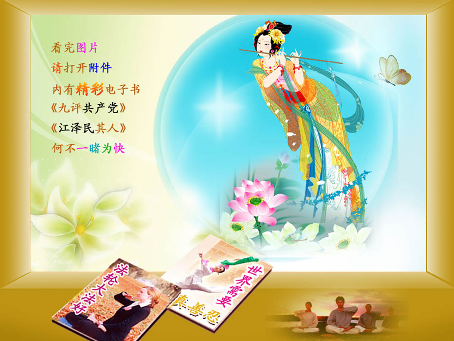 【明慧网二零零九年十一月九日】在欣赏今年大法弟子给师父的中秋贺卡时,看到一个落款为“大陆网络作真相小组”,得知其他同修也在用网络讲真相。现把我设计的几个用来配合文字资料一起发送的图片发给明慧,供同修选用。