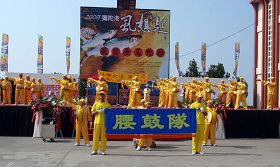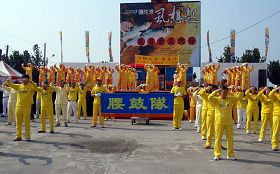 主办单位特别安排二十九日周日早上十一点人潮密集时段,邀请由法轮功学员组成的腰鼓队至会场主舞台表演,并进行法轮功五套功法演示,受到民众的热烈欢迎。