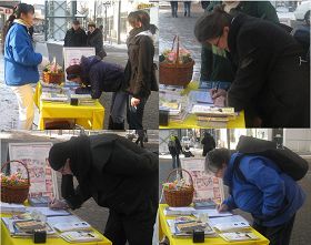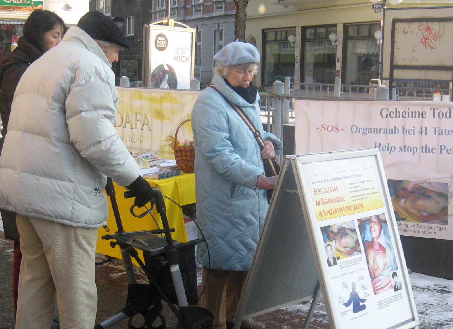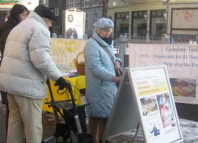 在第二周的时候,信息摊位来了一名德国老太太,她告诉法轮功学员,她是从女儿那里知道有关法轮功的信息的。上一周女儿把传单拿回了家,她阅读了,知道了这个事情。她在反迫害签名簿上签了字。