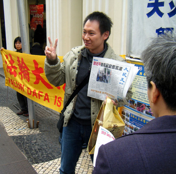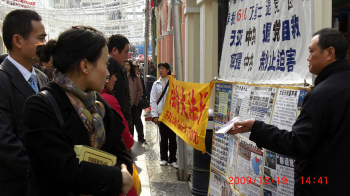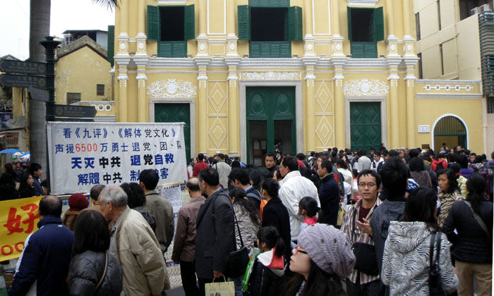 澳门法轮功学员打出“法轮大法好”,“法轮大法、真善忍”及“解体中共 停止迫害”等横幅。“玫瑰堂前地”大陆游客众多,当学员摆放横幅时,已有大批大陆游客围观,当横幅及真相图片打开后,游客纷纷取出照相机拍照,及主动向学员取阅真相资料。