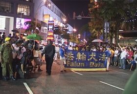 踩街游行在九时许正式开始,天国乐团开始向前行进,并演奏“法轮大法好”乐曲。乐团经过贵宾席后,道路两旁站满了挤得水泄不通的数千名观众,向路过的天国乐团喝彩欢呼。