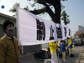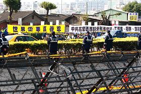 ![]() 法轮功学员在裕元饭店对面街道高举横幅 |