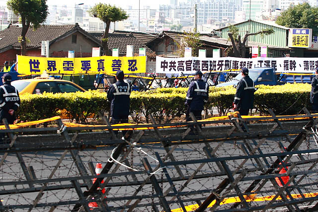 陈云林下了飞机,为躲避聚集的各抗议团体,出关时竟未走正常海关走道,而是偷偷从汉翔公司的大门离去。当车队离开汉翔时,迎面所见即是法轮功学员高举的“制止迫害法轮功”的横幅。从机场到裕元酒店,这一路下来,到处可见法轮功“制止迫害”的标语。