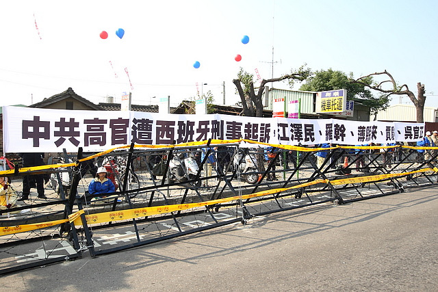 而在陈云林一行到达酒店之前,法轮功学员早已在酒店正门及后门布置好横幅。“中共高官遭西班牙刑事起诉,江泽民、罗干、薄熙来、贾庆林、吴官正”,长长的横幅,又大又清楚,正对酒店。学员静静地举着横幅,吸引很多过往民众的注视。