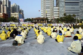 下午,法轮功学员陆续集结到裕元酒店前未管制的路段,制止迫害的横幅与黄色的炼功服构成一条显目的长龙,蜿蜒在中港路上。不论中共官员从哪儿进出,都躲不过法轮功学员制止迫害的呼声。