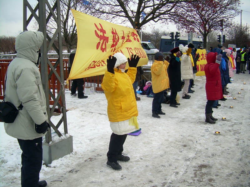 在哥本哈根的贝拉会议中心里,会议议程在紧张地进行着,会议中心外,来自北欧各国的法轮功学员迎着刺骨的寒风,静静地进行着功法演示,展示着法轮大法带给人们的祥和与美好,同时呼吁立即制止中共迫害法轮功。这些法轮功学员安静平和的修炼状态感动了世人。