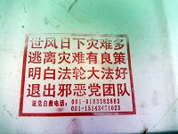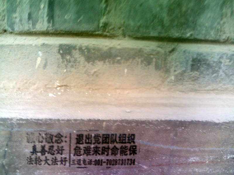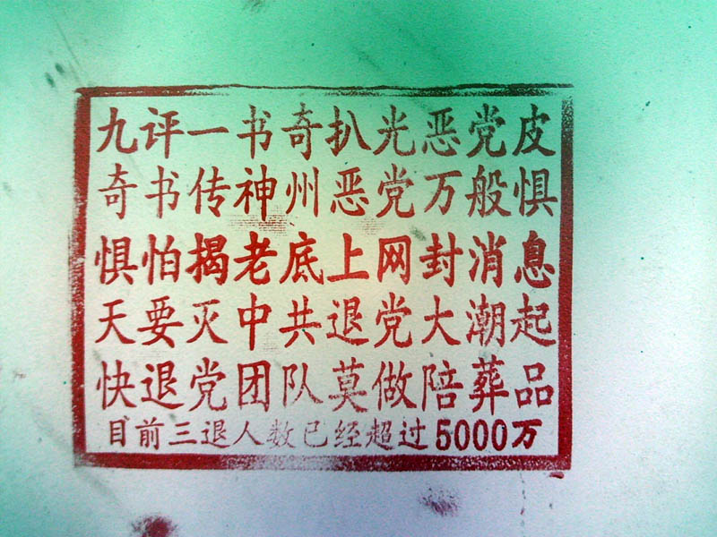 隆冬季节真相标语不容易粘贴,同修们开始用印章讲真相救度众生,只要是干净、平整的地方都是同修们用印章的首选。