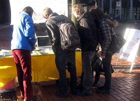 法轮功学员持续用德文播放着活摘器官的新证据。许多正义的德国人在反迫害征签簿上签了字。有的德国人驻足聆听新证据的内容,有的走到展位跟前看有关新证据的视频文件。一个中国女孩还在信息展位做了三退(退出中共党、团、队)。