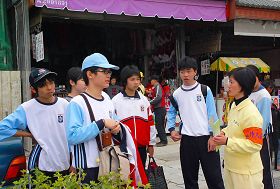 ![]() 学员向游客们介绍法轮功 |