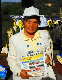 学员中,一位来自高雄的七十多岁的老阿嬷,站在人群中发简介资料。她修炼法轮功有七年了,还经常受邀去义务教授功法,她说:“以前我全身都是病,从小胃痛,还遗传地中海贫血症,医生说没药可吃。我学法轮功以后,几个月不知不觉就好了,精神也好起来了。我最近常去教功,他们都说我很年轻。”