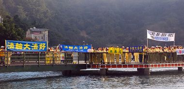 二十四日,码头上汇集了上千法轮功学员,来自台湾各地、各行各业。从早上一直到傍晚,他们在这里炼功、讲真相。吸引了许多游客驻足观看,并向学员表示要了解法轮功。整团整队的大陆观光团经过时,也纷纷拿出相机拍照留念。