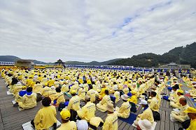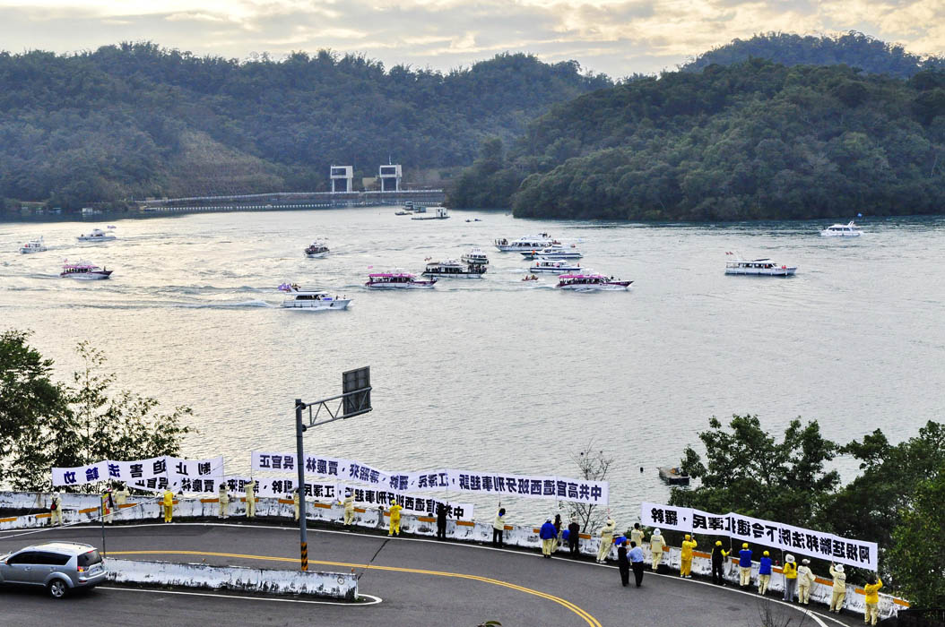 【明慧网二零零九年十二月二十九日】(明慧记者周容台湾南投采访报导)二零零九年十二月二十四日圣诞节前夕,在碧波千顷的日月潭畔,一幅幅写着“法轮大法好”、“制止迫害法轮功”的横幅,在金色阳光下迎风招展,码头上天国乐团振奋人心的演奏,和千余名法轮功学员黄色的身影吸引着过往游客的注目。