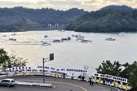 日月潭湖畔布满了“法轮大法好”、“制止迫害法轮功”的横幅。