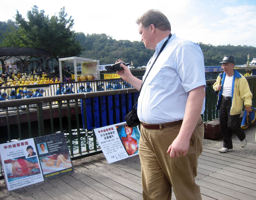 从纽约第一次来台湾的奈尔森(Nelson)先生和太太,拿起相机记录了法轮功学员的平和,及中共酷刑迫害的照片证据。奈尔森夫妇说,会把今天所看到的放在博客(blog)上,把这个讯息广传。奈尔森先生表示,这样的迫害不该持续,应该让更多的人一起站出来制止这场迫害。