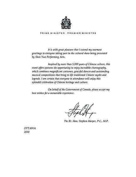 加拿大总理哈珀在贺信中,对所有参加神韵演出的人员表达了他热情的问候,并祝愿演出给观众留下美好的回忆。