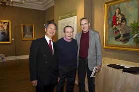 ![]() 参观大赛画展的油画家若斯(Roger Rossi,中)和艺术家麦克格莱恩(Joseph McGlynn,右一)与获优秀奖的画家刘庆祖(左一)合影 |